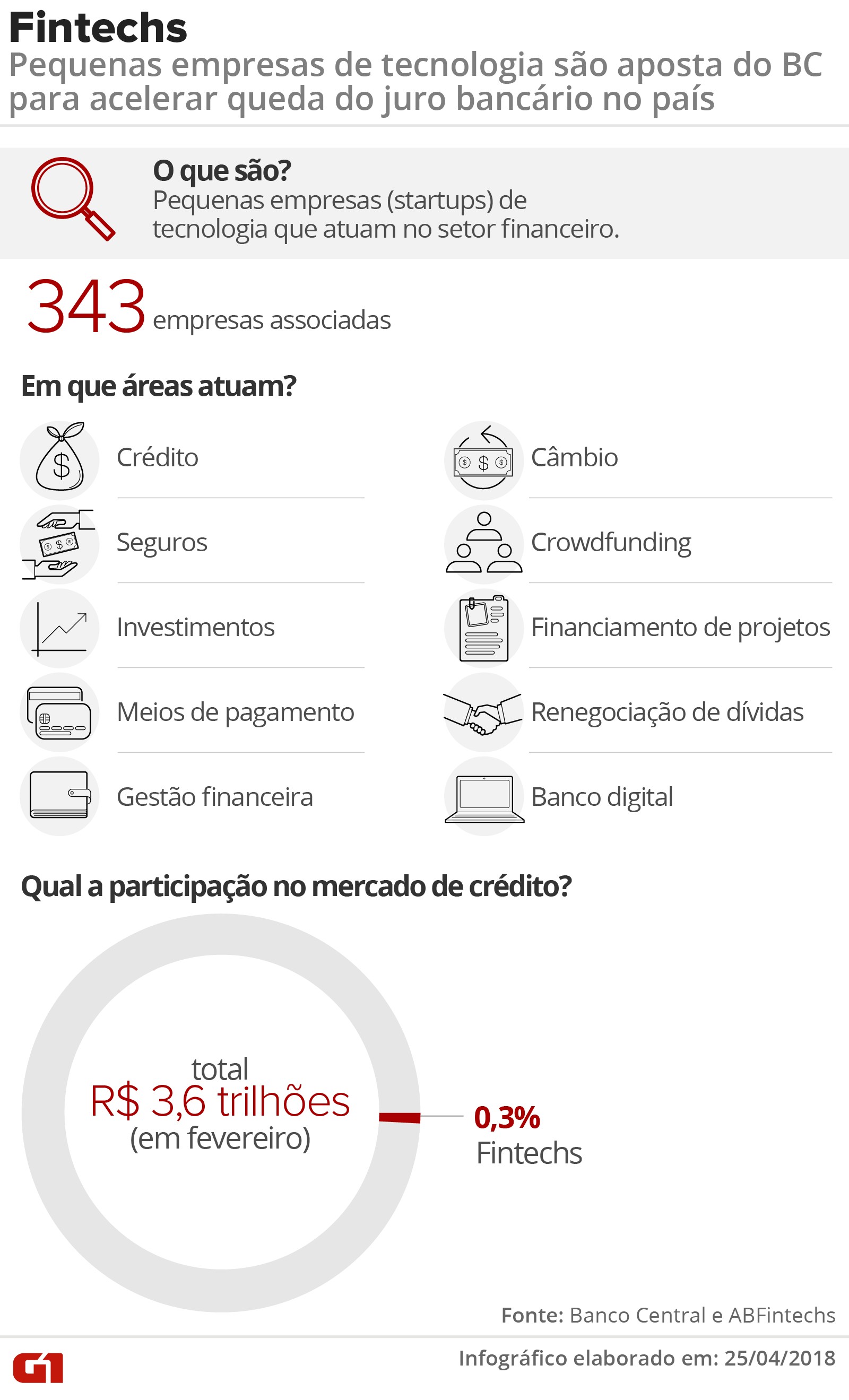 Regulamentação do setor, previsto para ser anunciada nesta quinta, pode acelerar crescimento dessas empresas, que hoje concentram 0,3% da soma dos empréstimos concedidos no país. O Brasil registrou nos últimos meses um aumento expressivo no número de “fintechs”, como são chamadas as pequenas empresas (startups) de tecnologia que atuam no setor financeiro e oferecem, por exemplo, contas digitais e crédito pela internet. Essas empresas são uma aposta do Banco Central para aumentar a concorrência no mercado de crédito e estimular uma queda mais rápida dos juros bancários.