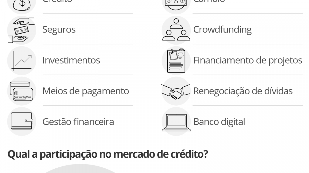 Mas há empresas atuando também em investimentos, gestão financeira, câmbio, “crowdfunding” (financiamento coletivo, as famosas “vaquinhas” virtuais), criptomoedas , “blockchain” (corrente de blocos, em tradução literal), “funding” (financiamento de projetos); renegociação de dívidas e banco digital, entre outras.