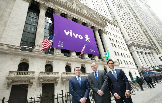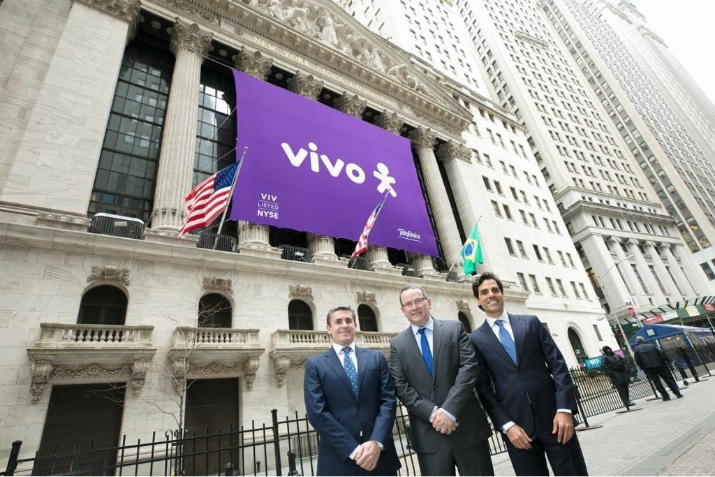 Anúncio ocorre dias após a empresa desistir de acordo com a Anatel, em que troca multas por investimento. Executivos da Vivo em frente à Bolsa de Valores de NY; David Melcon (vice-presidente financeiro da Telefônica Brasil), Eduardo Navarro (presidente) e Christian Gebara (vice-presidente executivo). Divulgação/Telefônica…