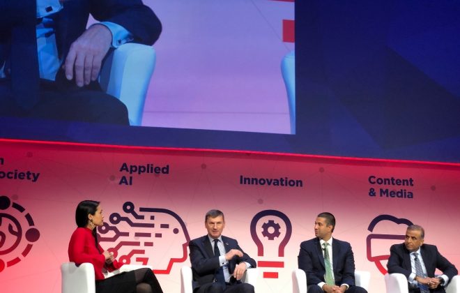 Debate ocorre poucos meses após a Comissão Federal das Comunicações dos EUA ter derrubado as regras que garantiam a isonomia no tráfego da internet. Da esquerda para direita: Jornalista Kristie Lu Stout, da CNN, mediou debate entre Andrus Ansip (vice-presidente da Comissão Europeia) e Ajit…