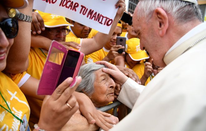 Pontífice disse que atualmente muitos jovens se sentem atingidos por medos e que em muitos ‘existe um profundo medo de não ser amado e querido pelo que é’. Papa Francisco abençoa Trinidad, de 99 anos, durante sua passagem por Trujillo, no Peru, em imagem de…