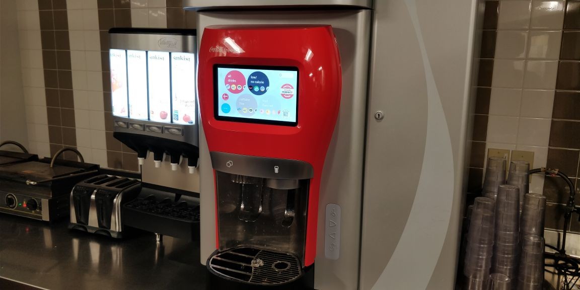 Máquina permite que consumidores criem sua própria bebida combinando centenas de ingredientes, e envia estatísticas para servidor. Máquina de fazer refrigerante da Coca-Cola em um hotel em Austin, no Texas.