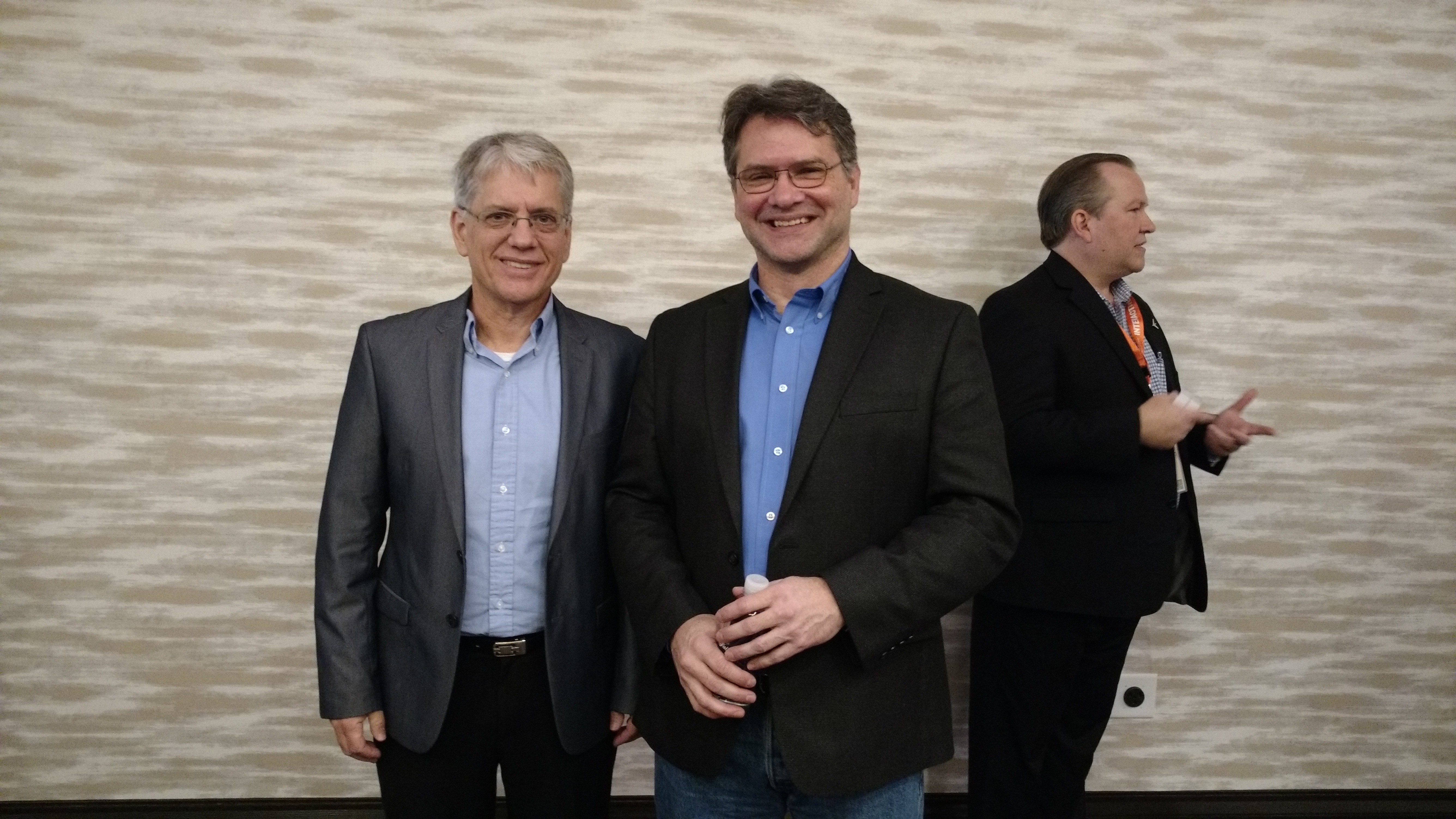Empresas anunciaram em 2017 acordo para desenvolver um sistema de transporte urbano aéreo em pequenos veículos. Antonio Campello, diretor de inovação corporativa da Embraer, (à esquerda) posa ao lado de Mark Moore, da Uber, após palestra no SXSW