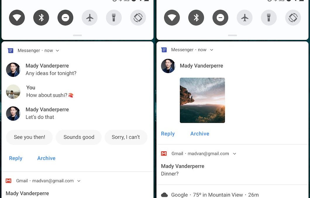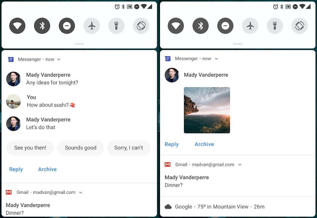 Na versão apresentada a desenvolvedores, o Android P ganhou uma aba de notificações com a função MessagingStyle. Com ela, quando uma nova solicitação de um aplicativo chega, é possível respondê-la sem que o serviço precise ser aberto.