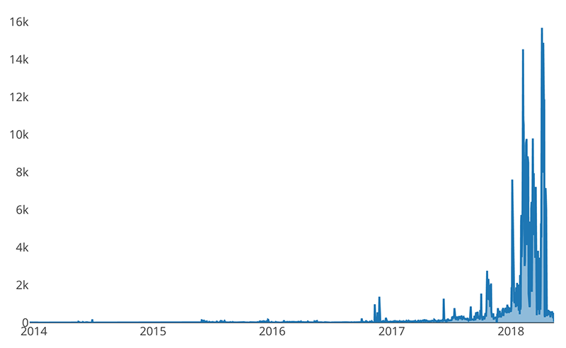 Gráfico de evolução do uso de programas de mineração forçada por hackers mostra explosão da popularidade destes ataques desde o fim de 2017. Números não incluem a mineração web