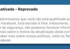 (Foto: Comunicado do Facebook de que a conta foi desativada.)