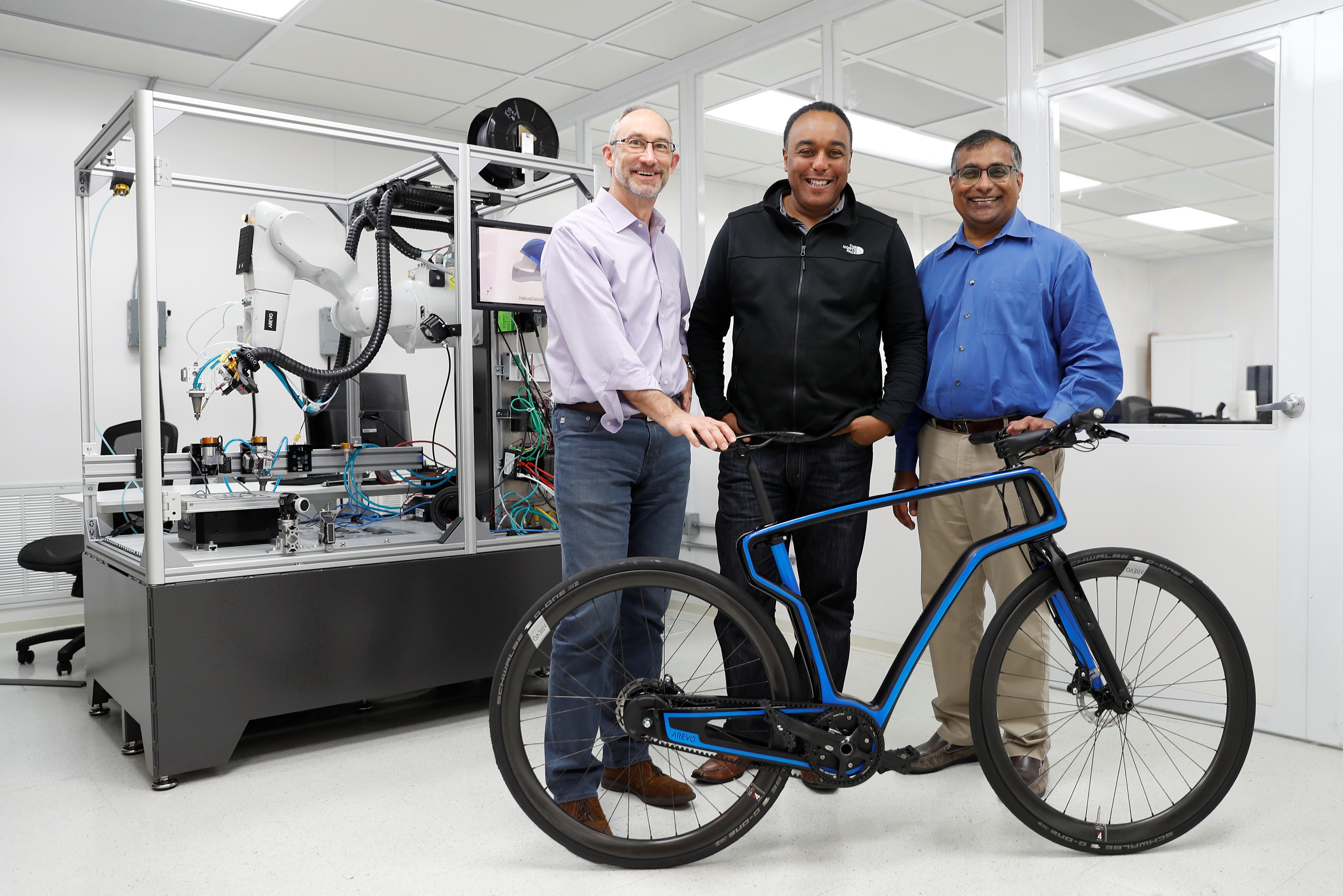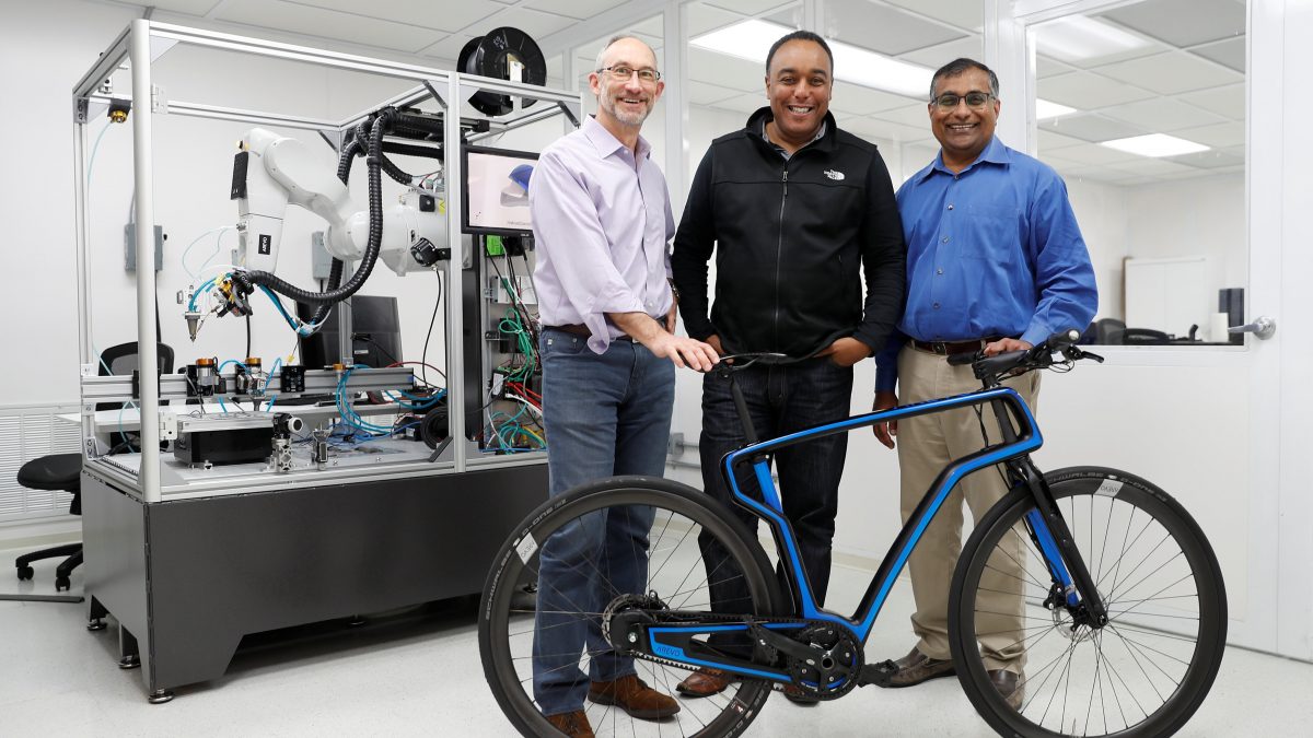 Fundada por ex-executivo de Google e Amazon, empresa iniciante recebeu investimento US$ 12,5 milhões para tornar a tecnologia de impressão mais barata. Executivos da Arevo Labs, startup que usa impressora 3D para fazer bicicletas de fibra de carbono: Jim Miller, Wiener Mondesir e Hemant Bheda.