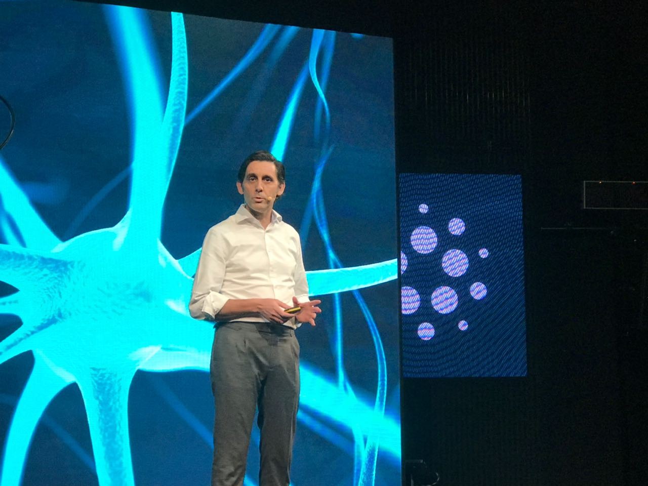 Batizada de Aura, tecnologia foi apresentada ao público no ano passado, mas só em 2018 chegará ao serviço de atendimento aos clientes. José María Álvarez-Pallete, presidente do conselho da Telefónica, durante anuncio da chegada do assistente virtual da empresa